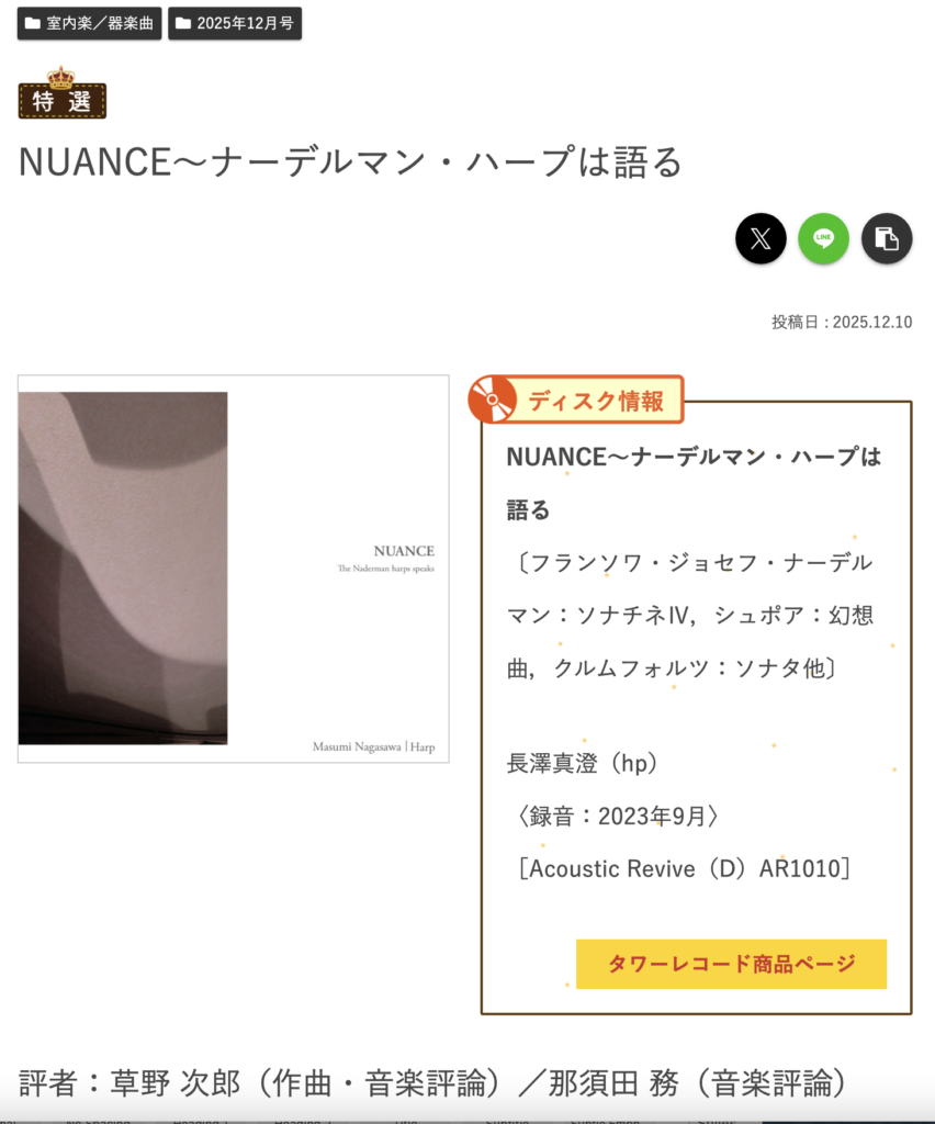 It was a delightful surprise and an honour that my CD ‘NUANCE ~ The Naderman harps speak’ received a ‘Special selection from the prestigious Japanese music magazine last December.